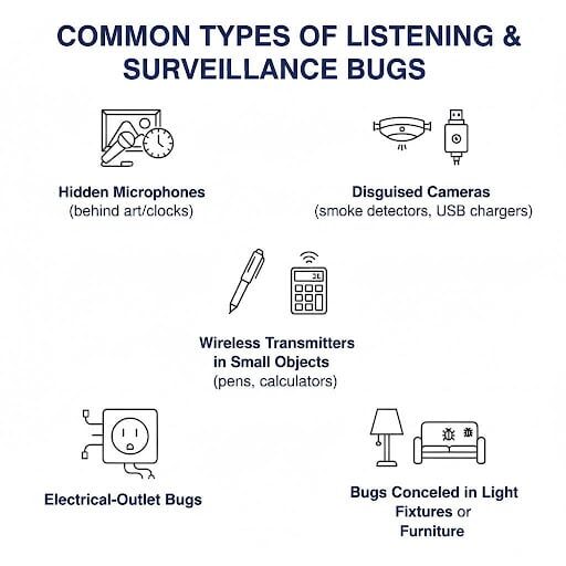 While physical bugs such as hidden microphones and disguised cameras remain a threat, modern surveillance has shifted heavily toward digital methods, many of which leave no visible trace. Today, spyware on smartphones, compromised laptops, hacked smart-home devices, and even side-channel leaks from everyday electronics pose greater privacy risks than traditional "bugs in outlets."